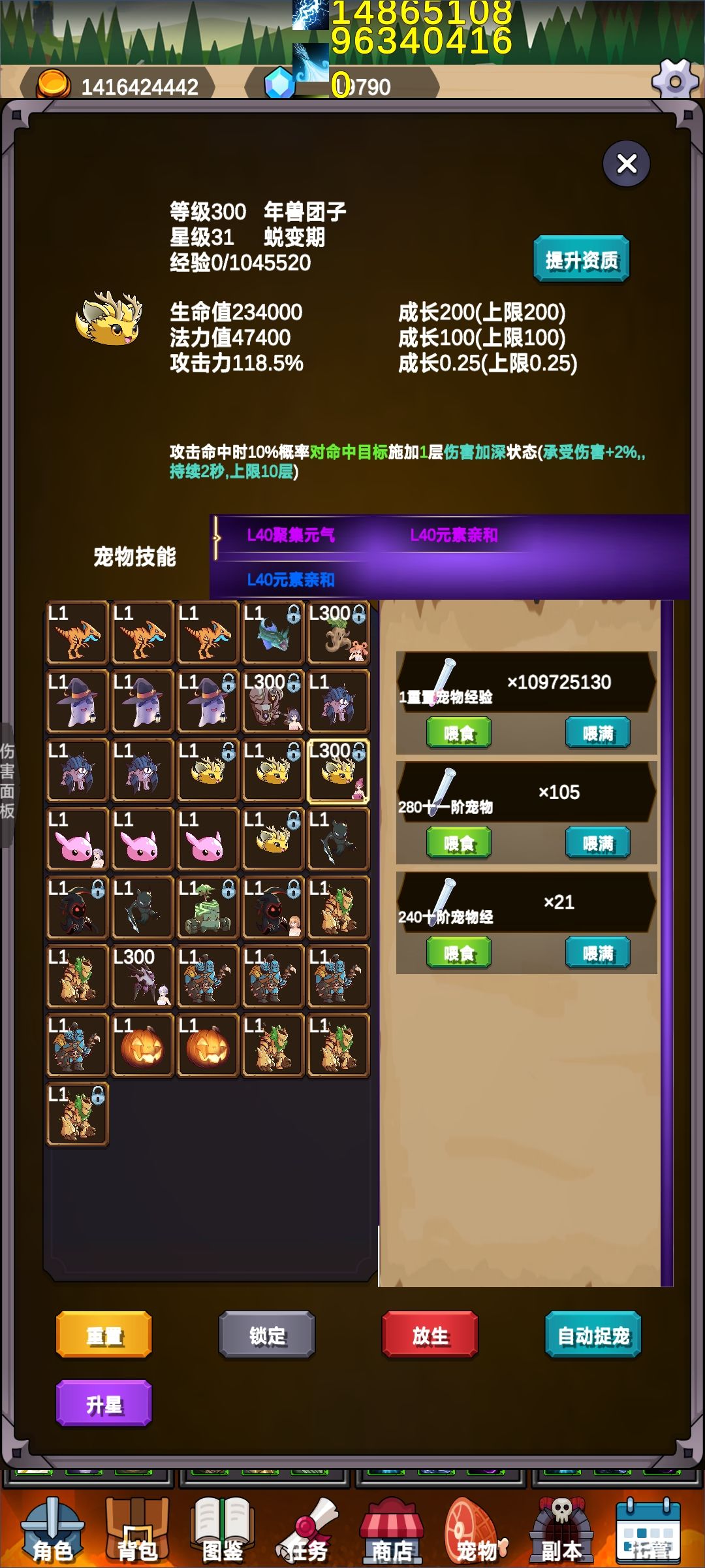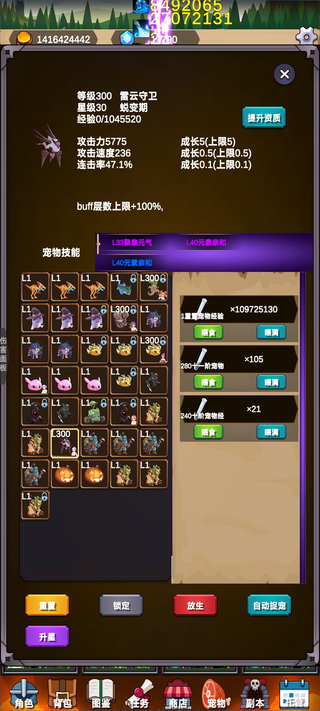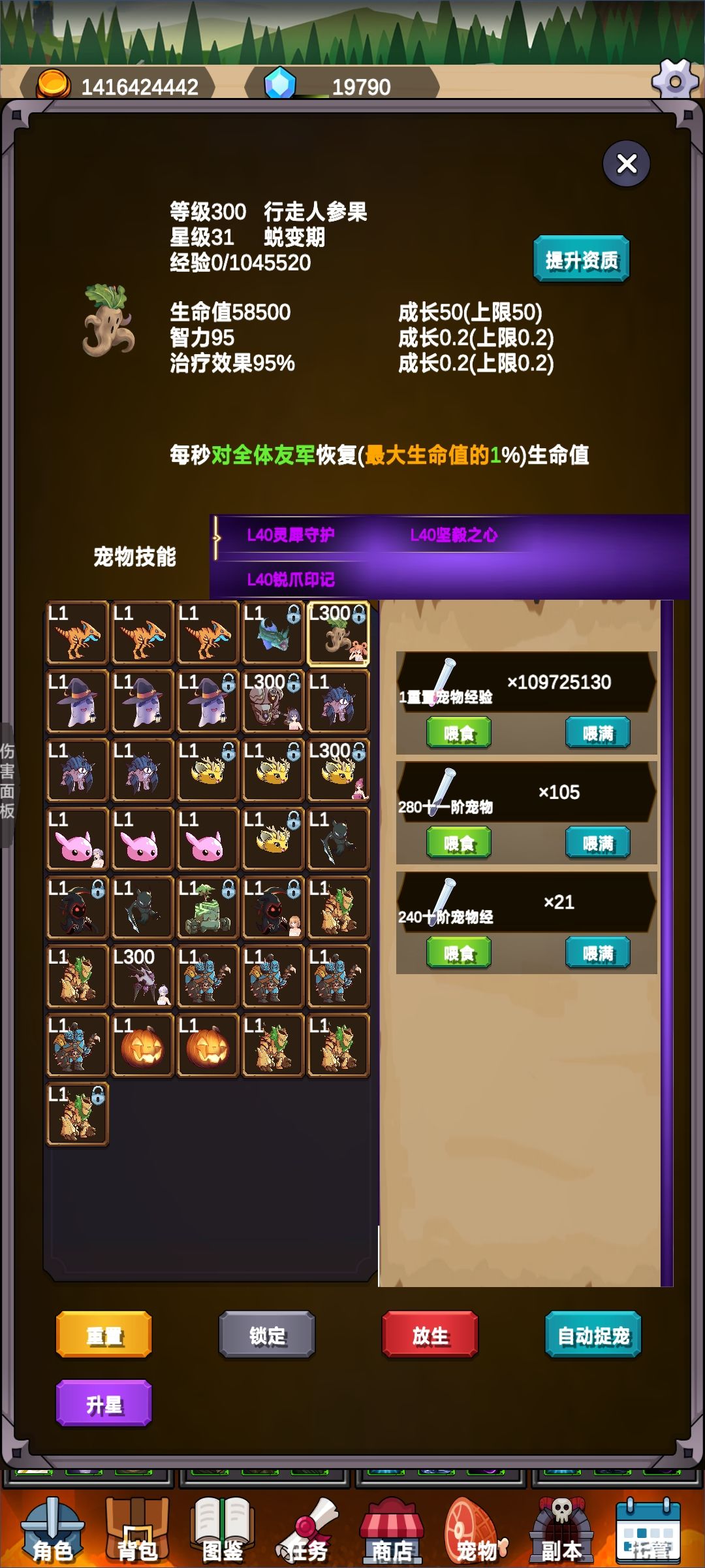 不语牧:全套不语+魔法棒+星核+戒指×2,宠物带十星以上人参果(坚毅、灵犀、锐爪),人参果吃暴击、治疗效果、接受治疗效果,我400+w血骑士每秒回复46w血