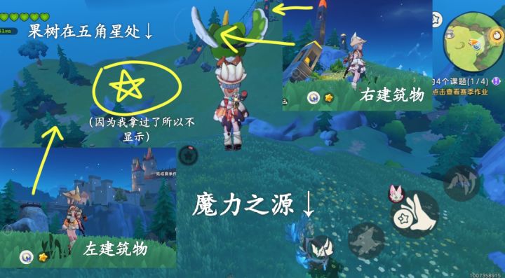 p1从魔力之源的山坡上直接往倒3草地处走就能看见 p2为果树左右的建筑参照物 p3编号及果实样子