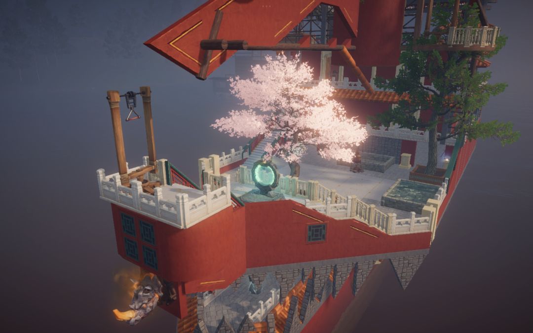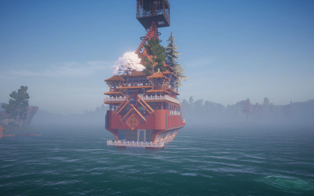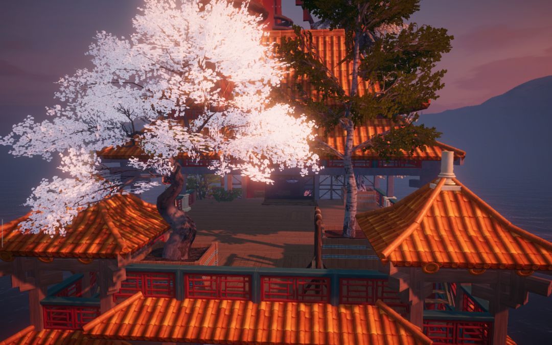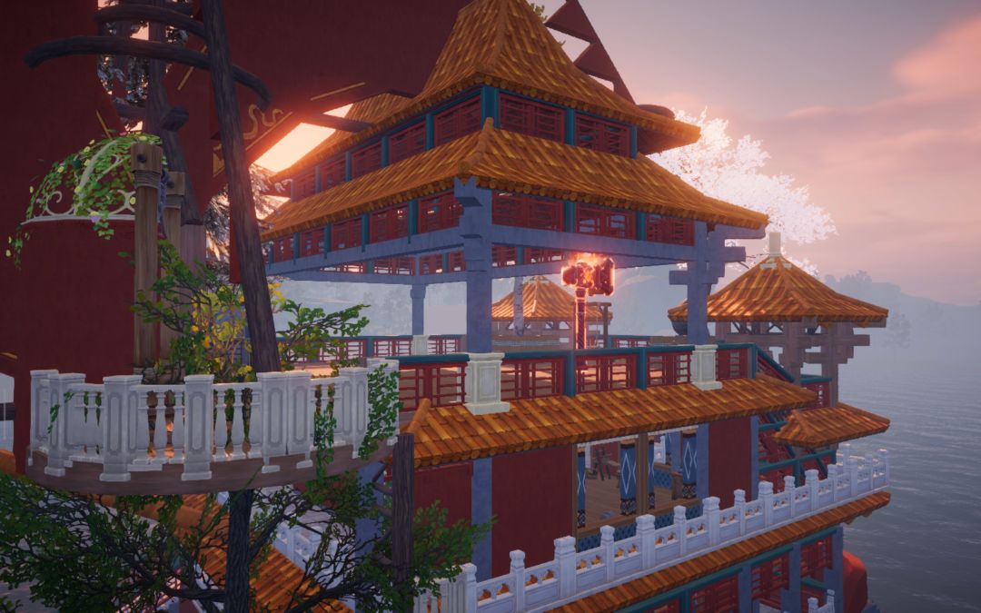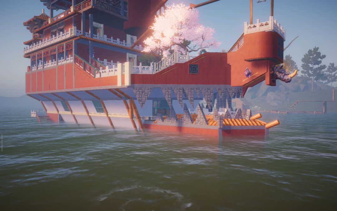 转向海面,朱红古船载着重檐亭台破浪而来,船头的兽首与桅杆的花树,藏着东方浪漫的极致写意。黄昏时飞檐镀上暖光,雨夜中闪电劈开迷雾,星空下望远镜遥向月轮——每一处转角,都是匠心雕琢的秘境,每一帧光影,都是属于这个世界的、永不落幕的东方幻想。