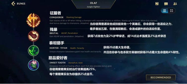 主系符文老白推荐征服者,这个符文对于奥拉夫这种战士英雄来说提高非常之高,副系第一个可以点残暴增加伤害,也可以点凯旋增加杀人后的回复能力,第二个可以点泰坦猎手,通过击杀来提高自己的坦度,最后一个符文推荐甜品爱好者,对线期性价比爆表,谁用谁知道!