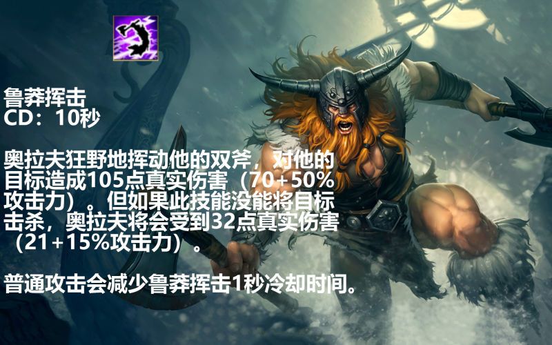 作为一个猛男,奥拉夫猛就猛在他的被动技能上,攻速随着已损生命值等比增长,血量越低,攻速越高,这意味着只要敌人敢跟奥拉夫一对一站撸,越打到后面奥拉夫砍得越快,残血的时候更是别人砍一刀的功夫,奥拉夫就已经劈了两斧子出去,这谁顶得住啊。所以各位小伙伴千万注意,对线奥拉夫的时候千万不要看他血量低就轻易上去对拼,说不定就被他一套乱披风斧法砍翻在地。而自己玩奥拉夫的时候哪怕残血也不要害怕,抄起斧子干就完了!