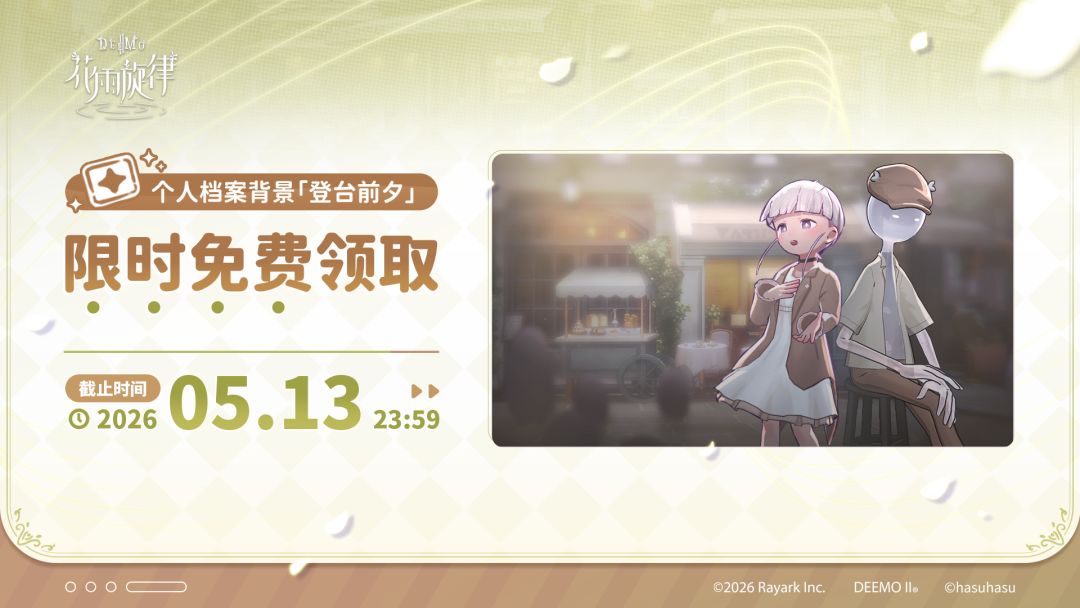 ◆ 2026/5/13 23:59前登录游戏,即可通过邮箱领取个人档案背景「登台前夕」!