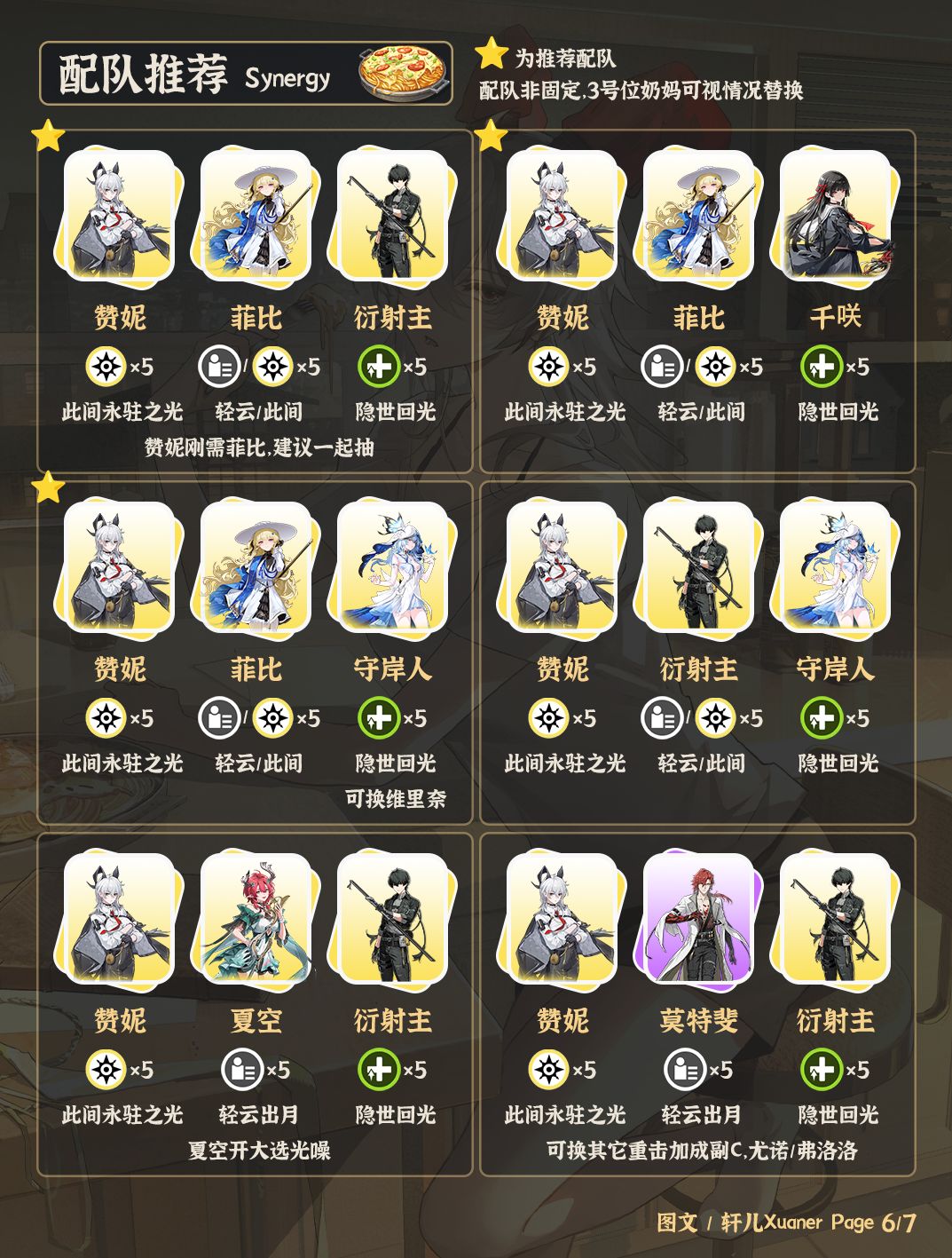 ⑤ 赞妮是光噪效应主C。配对上比较局限,刚需菲比打高伤害。三号位奶妈可带衍射主/千咲/守岸人。如无菲比可暂时带衍射主/夏空做副C过渡。