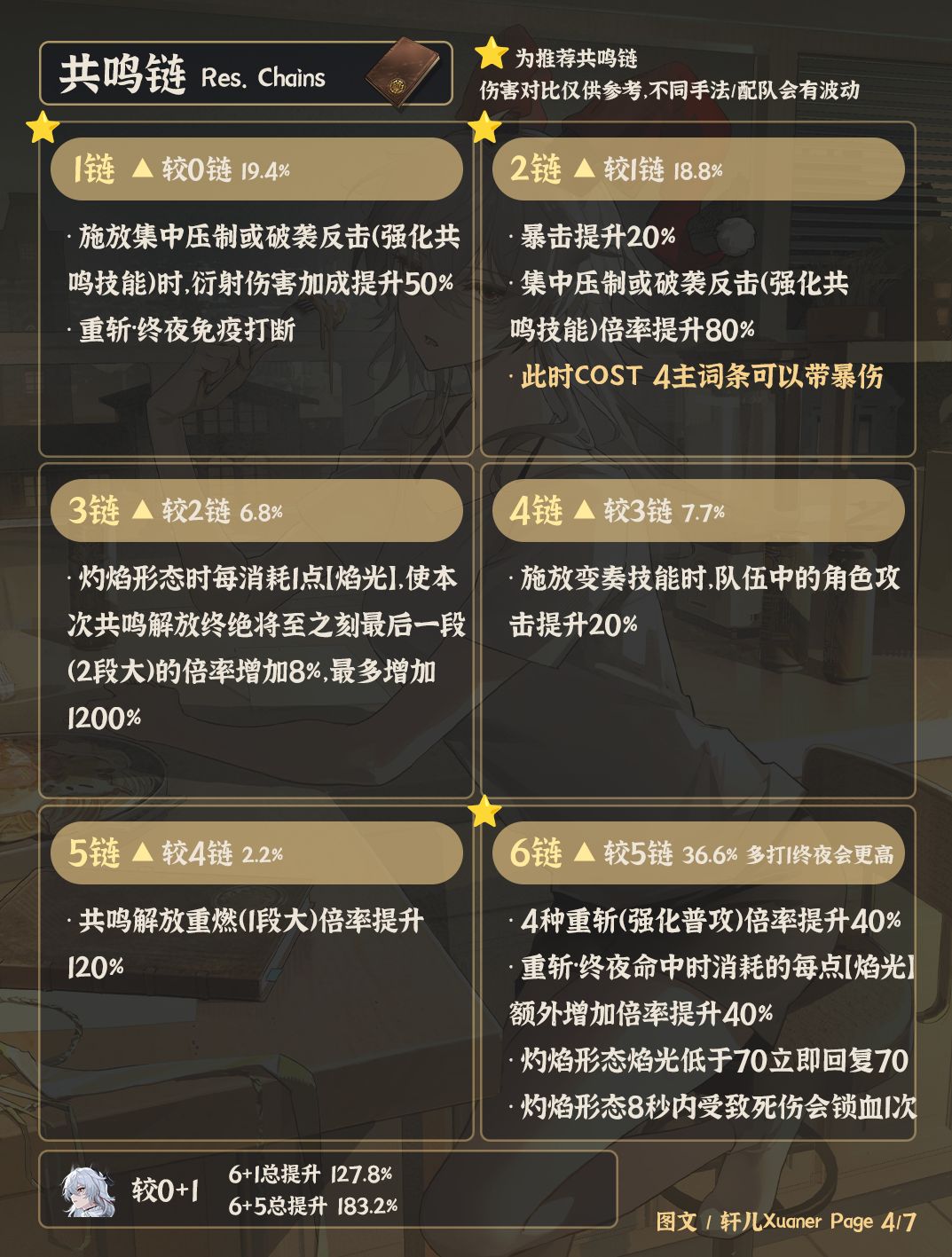 ③ 赞妮共鸣链推荐抽取1/2/6链。1链提升伤害不错,且终夜免疫打断。2链提升部分伤害。6链伤害提升幅度很大,不合轴可以多打一套终夜,且有锁血。3/4/5链提升较小不推荐。