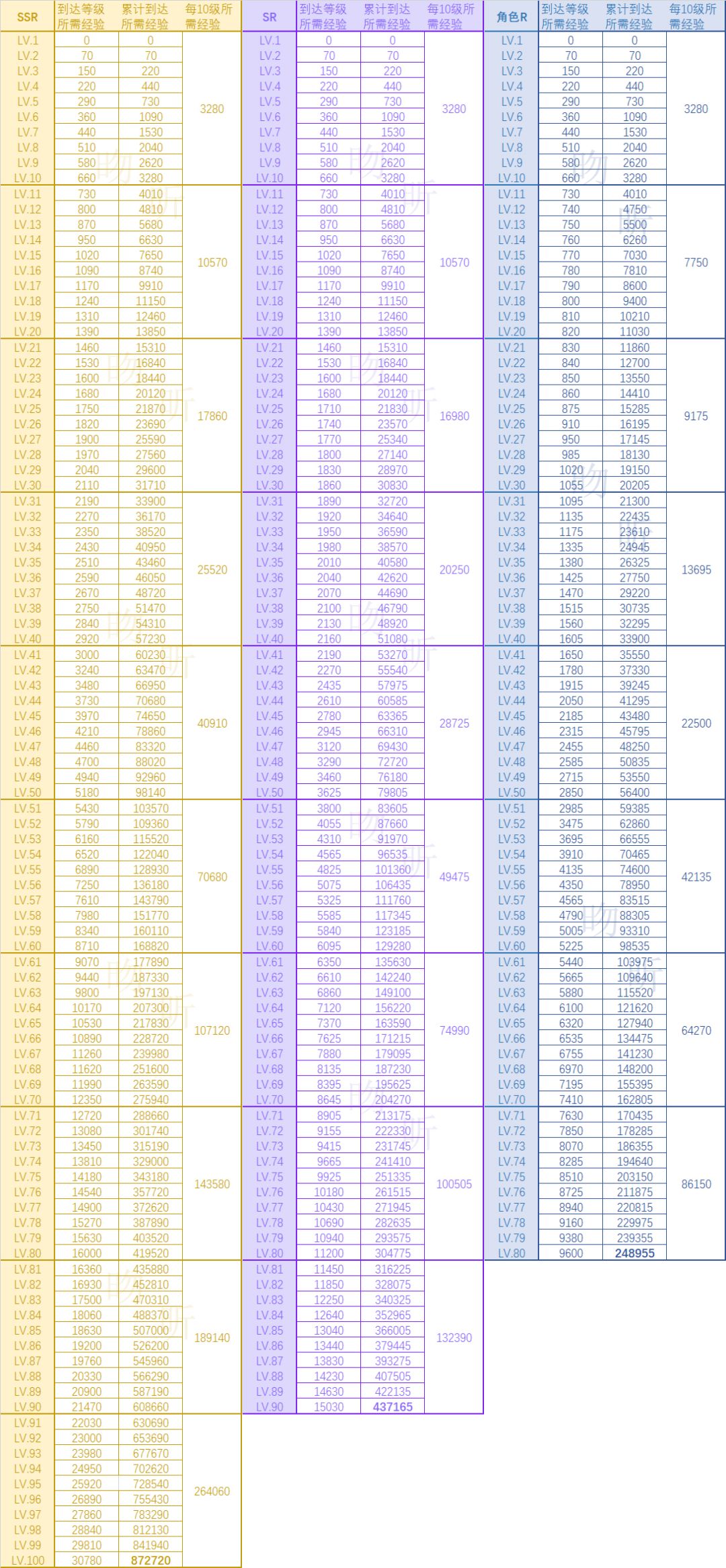 角色升级所需经验统计(更新可横向对比的汇总图)