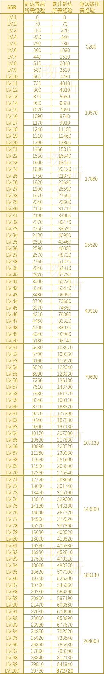 SSR满级需要87.3万,SR需要43.7万,R需要24.9万