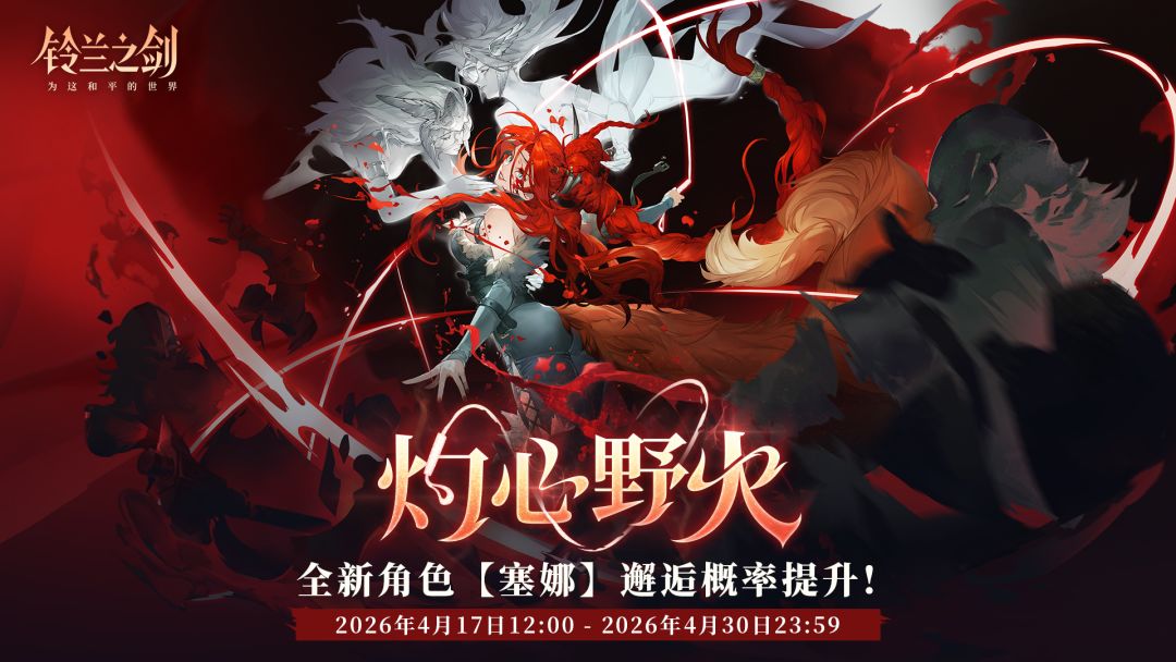 「灼心野火」初遇限时邂逅将于 2026/04/17 12:00 - 2026/04/30 23:59 开启,全新传说角色「塞娜」邂逅获取概率将大幅提升!