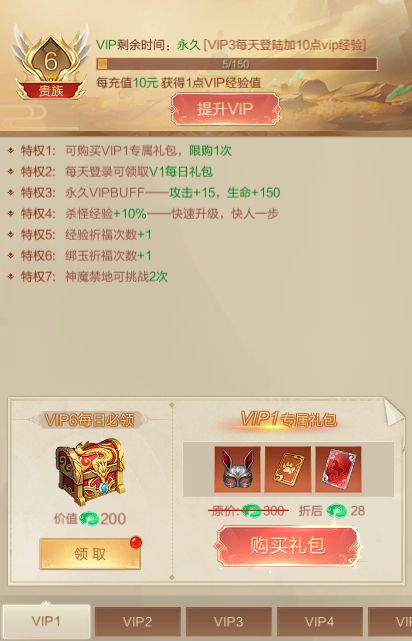 特权 1:专属礼包 ×1,每日礼包,攻击 + 15,生命 + 150,杀怪经验 + 10%,经验祈福与绑玉祈福次数 + 1,签到奖励翻倍,神魔禁地可挑战 2 次。