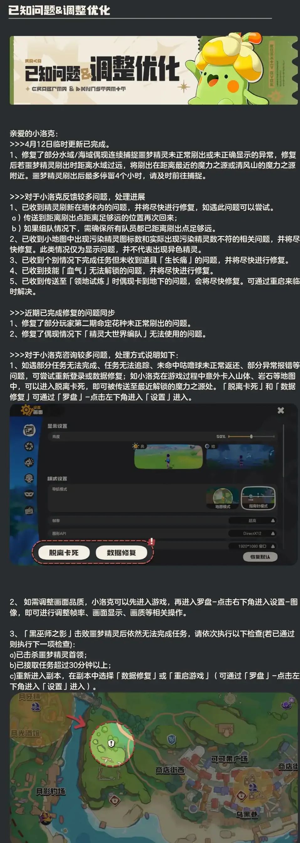针对噩梦精灵刷新异常的高频问题,更新后修复了水域、海域场景中,连续捕捉后噩梦精灵不刷出或显示异常的漏洞。同时优化刷新规则,若噩梦精灵刷出位置过远,将自动调整至最近的魔力之源或清风山魔力之源附近,且刷出后最多停留4小时,方便玩家及时前往捕捉。