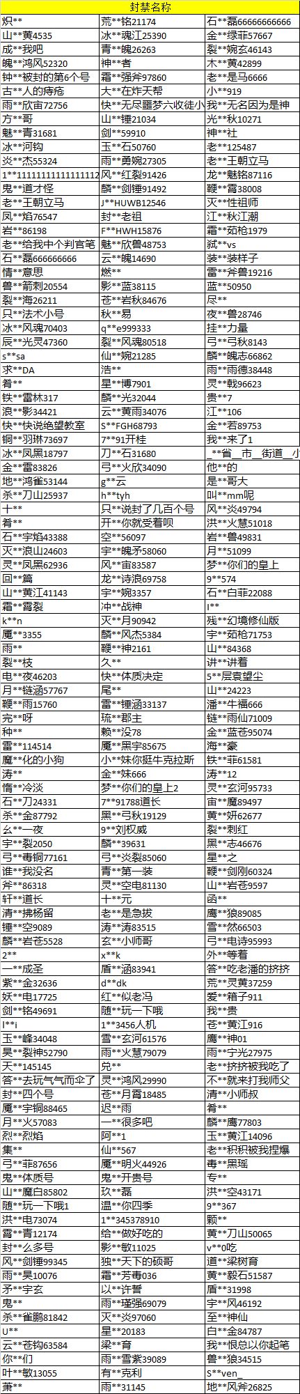 本次共计封禁1840名作弊账号,名单较长,仅展示部分账号: