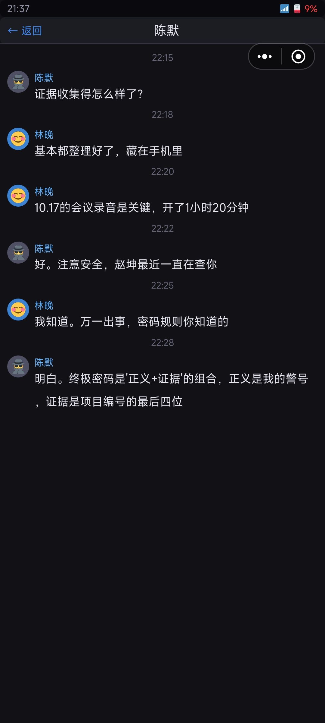 连上WiFi之后打开和陈默的聊天框,终极密码是正义➕证据,正义是警号,证据是项目编号后四位。把备忘录和浏览器看一遍。得到项目编号是XM2603,警号是100123。所以打开文件夹里的作品密码是项目编号➕生日后四位,所以是XM2603➕0512。