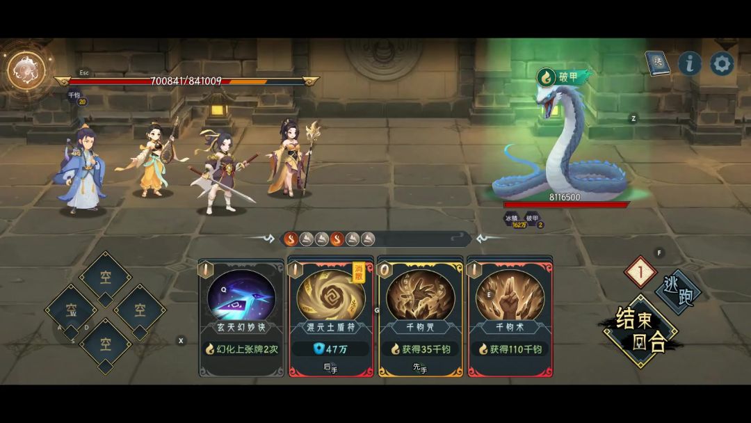 另外如果第一回合盾量不足,可以考虑主角换碎岩枪,直接复制化盾符,赌摄魂。理想情况是有石头的情况下,复制1费卡将灵气用光,打出叠嶂符再用随机的石头赌摄魂。