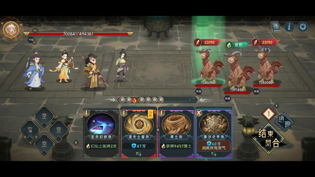 具体的手法看视频,主要是第一回合用光灵气打出叠嶂符,和崩山化盾符。如果第一回合没有压力可以留化盾符。第二回合主角复制崩山化盾符。后续可以依靠反震,石子清理多怪,或者等厚土叠满不怕清盾后被打死即可。