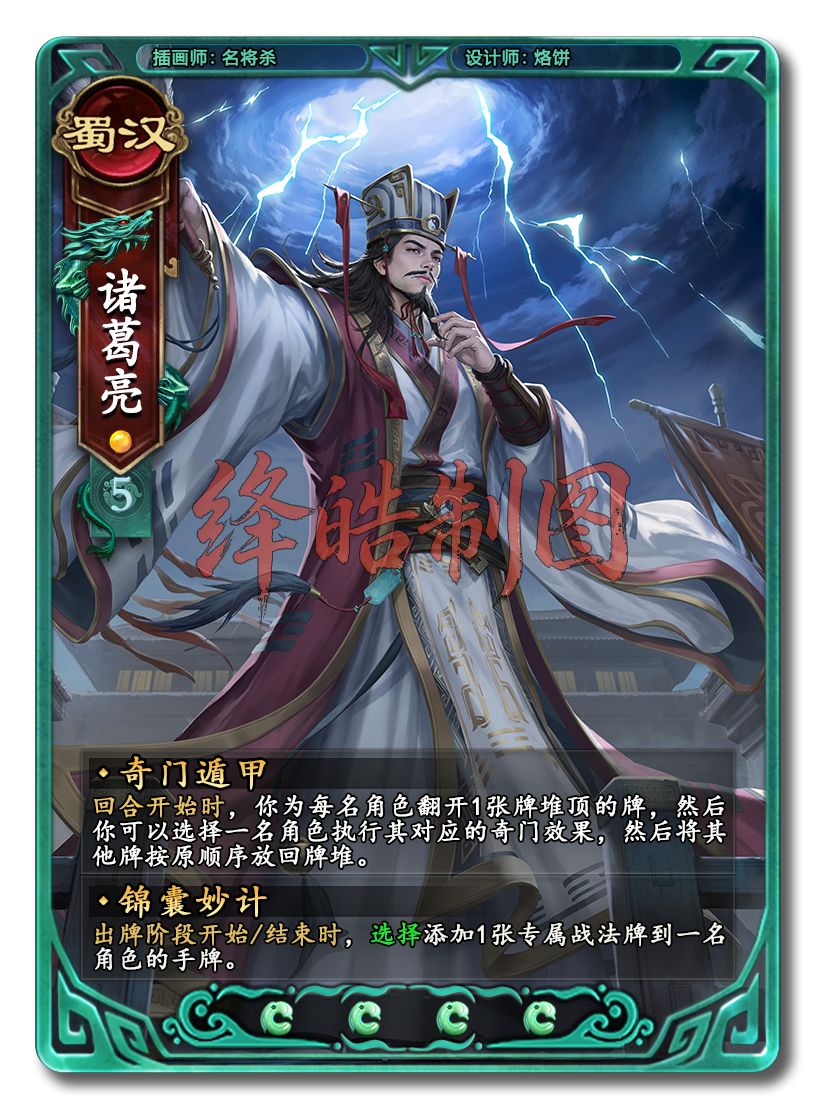 二技能8张专属牌锦囊,从(点数1)舌战群儒,(点数2)草船借箭,到(点数3)七星祭风,(点数4)智取华容。我似望见了先生羽扇轻挥,赤壁风起,烈火横江,照彻千古;从(点数5)七擒七纵,(点数6)空城计,到(点数7)上方用火,(点数8)借尸还魂,我似望见了丞相七擒孟获,六出岐山,鞠躬尽瘁,死而后已。出师一表真名世,千载谁堪伯仲间! 徐州城主将框里有诸葛丞相已经可以开香槟了,甭管有多少强敌,看我锦囊妙计一一破之。
