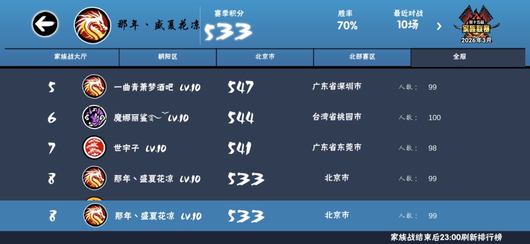 族战方面:稳定八级战场,全服前列,上届联赛勇夺季军!