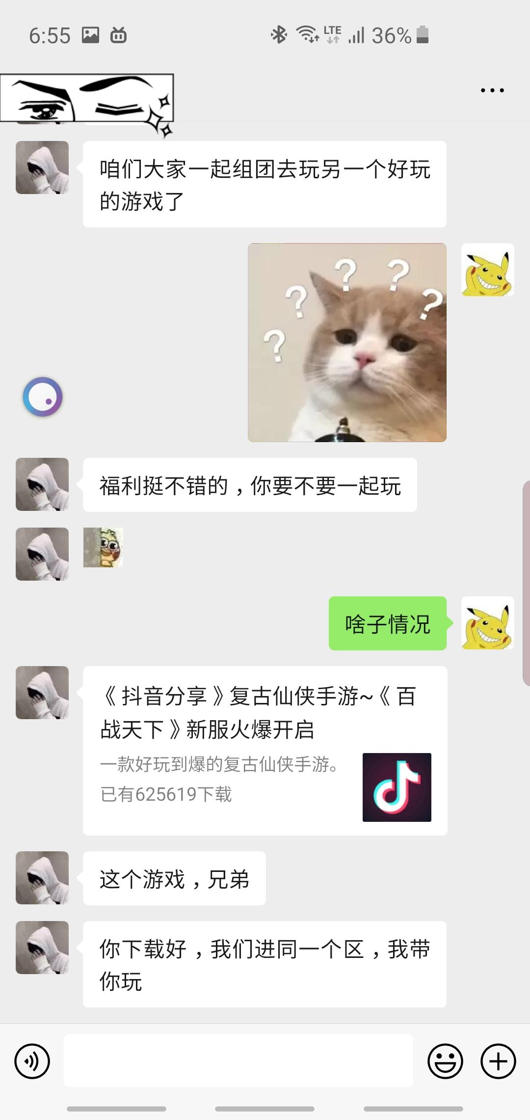 今天第一次玩进了个人少的帮派然后那个帮主说要加微信群找我要微信号我就给了没想到加上以后他一开口我就觉得这话好熟悉