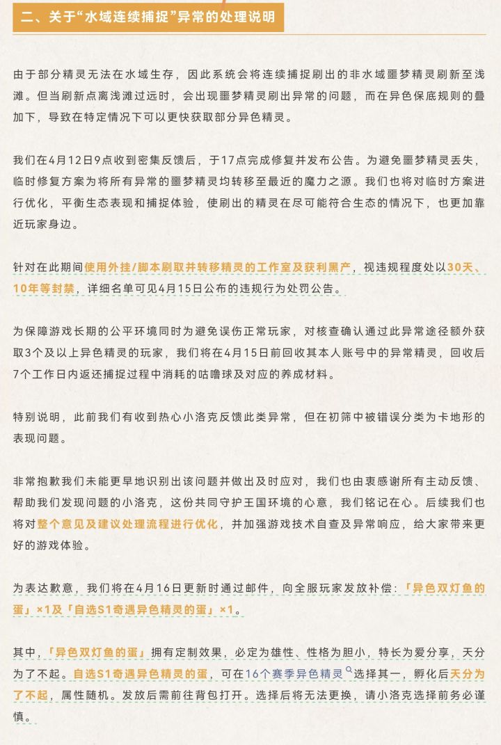回顾倍率也大幅提升:污染血脉精灵从3倍提至5倍,炫彩与异色精灵提至10倍。全服将发放两枚定制蛋:「异色双灯鱼的蛋」必定孵化雄性、胆小性格、爱分享特长、了不起天分;「自选S1奇遇异色精灵的蛋」可从16个赛季异色精灵中自选一个,孵化后天分为了不起,属性随机。异色精灵新增发现提示:屏幕右上角弹窗+头顶图标。