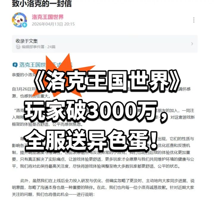 就在昨天晚上,魔方工作室发布了一封致玩家信,官宣《洛克王国:世界》开服18天累计玩家数突破3000万(如图)。官方同步推出一系列优化调整:①光合球、调温球等9种条件球合成配方简化,从“1普通球+2作物+洛克贝”改为“1普通球+1作物”,不再消耗洛克贝;②周末远行商人条件球售价下调3000;③全地区采集物与矿石刷新时间统一为22小时,新增部分精灵产出「幽幽鬼火」「海神花」等生态资源;④安妮商店高级咕噜球单价降至12000。
