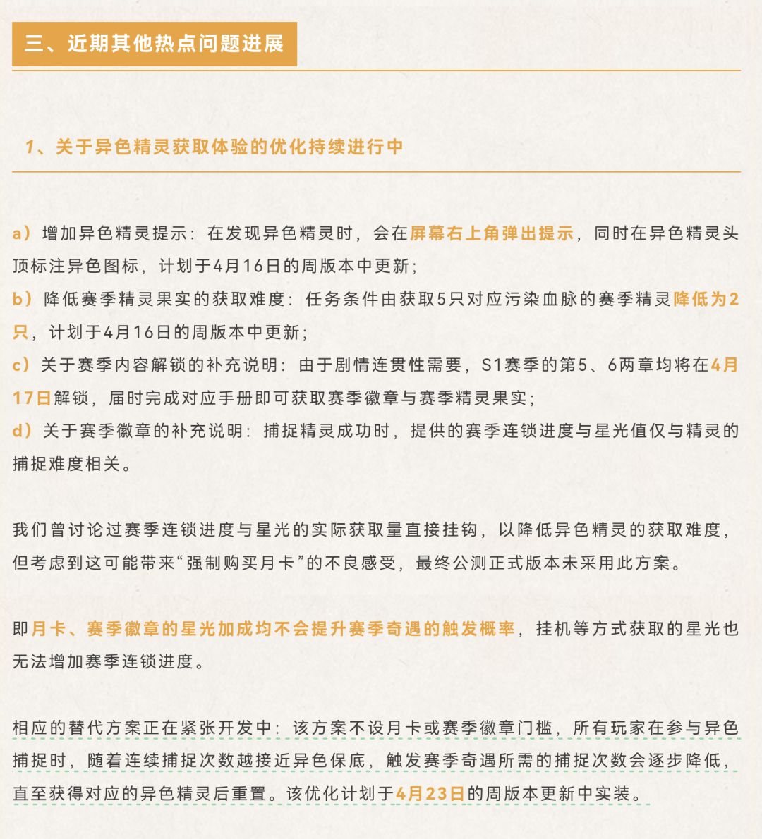 赛季精灵果实获取难度也有降低,任务条件从“获取5只对应污染血脉赛季精灵”改为2只。S1赛季第五、第六章将于4月17日解锁,完成手册可获赛季徽章与精灵果实等。