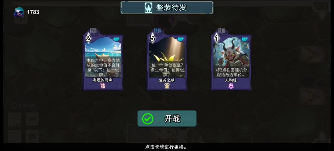 开局刷抽牌的卡,加上装备法耗降至-4,连锁抽二,抽二,技能抽一,放哈索尔,神速,突击,连锁泰坦,回忆连锁泰坦。注意其他牌都别出,会被扣死,此套流程共需出七张牌,会崩28点血,出牌时记得注意扣血量,如果发现扛不住下一次了就丢天狗,可以奶上去(先结算回血,后结算扣血)。