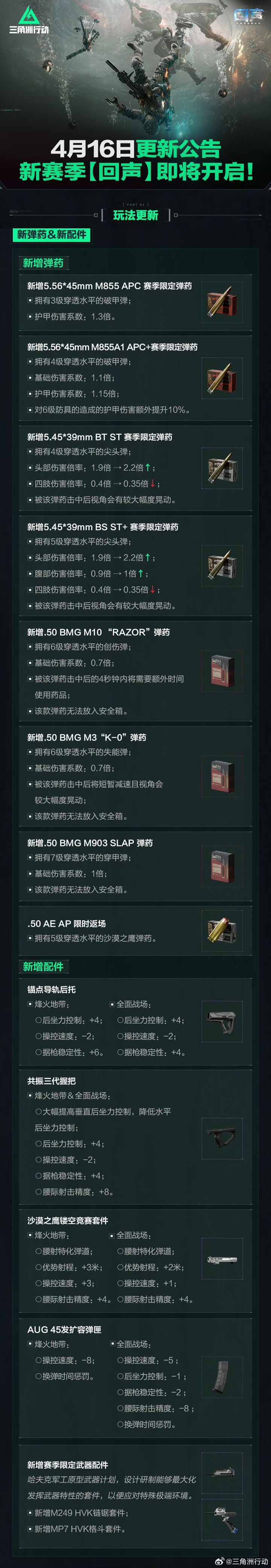 新赛季内容量很足,回响的声波干扰器能造成减速、视野模糊等多重负面效果,配合特长声音感知,在烽火地带应该会成为热门侦察位。新增的7级穿甲弹和6级创伤弹对高护甲敌人威胁巨大,但无法放入安全箱也增加了风险。4月16日凌晨更新,干员们记得提前做好准备。 #今天游戏圈发生了啥 #资讯评论员 #三角洲行动