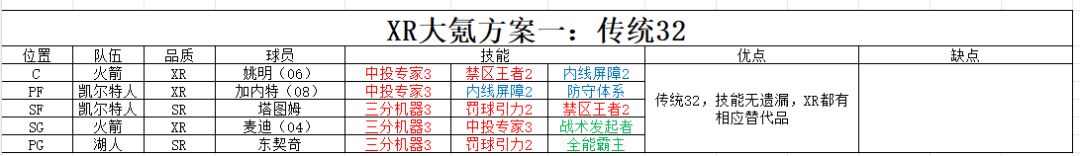 这是非常非常非常传统的3XR32造犯规阵容,传统到大家可以看吐,在XR/X出了备选技能后,加内特有了内线屏障,替换掉协防达人,使得这套阵容更加完美。