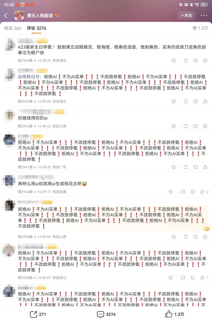 网易素来对海外玩家反馈响应较快,对国内意见则常“装死”。此次若不能尽快回应并平息怒火,游戏社区生态与长线运营恐面临严峻挑战。4.23停氪并卸载游戏的声援还在冒头。AI在游戏美术中的应用虽是行业趋势,但玩家并非反对技术本身,而是反感敷衍了事的品质与傲慢态度。游友们如何看待这件事情呢?![[表情_猫咪举手]](https://img-tc.tapimg.com/market/images/a3c0b426c5410082eae426404982cc0e.png)