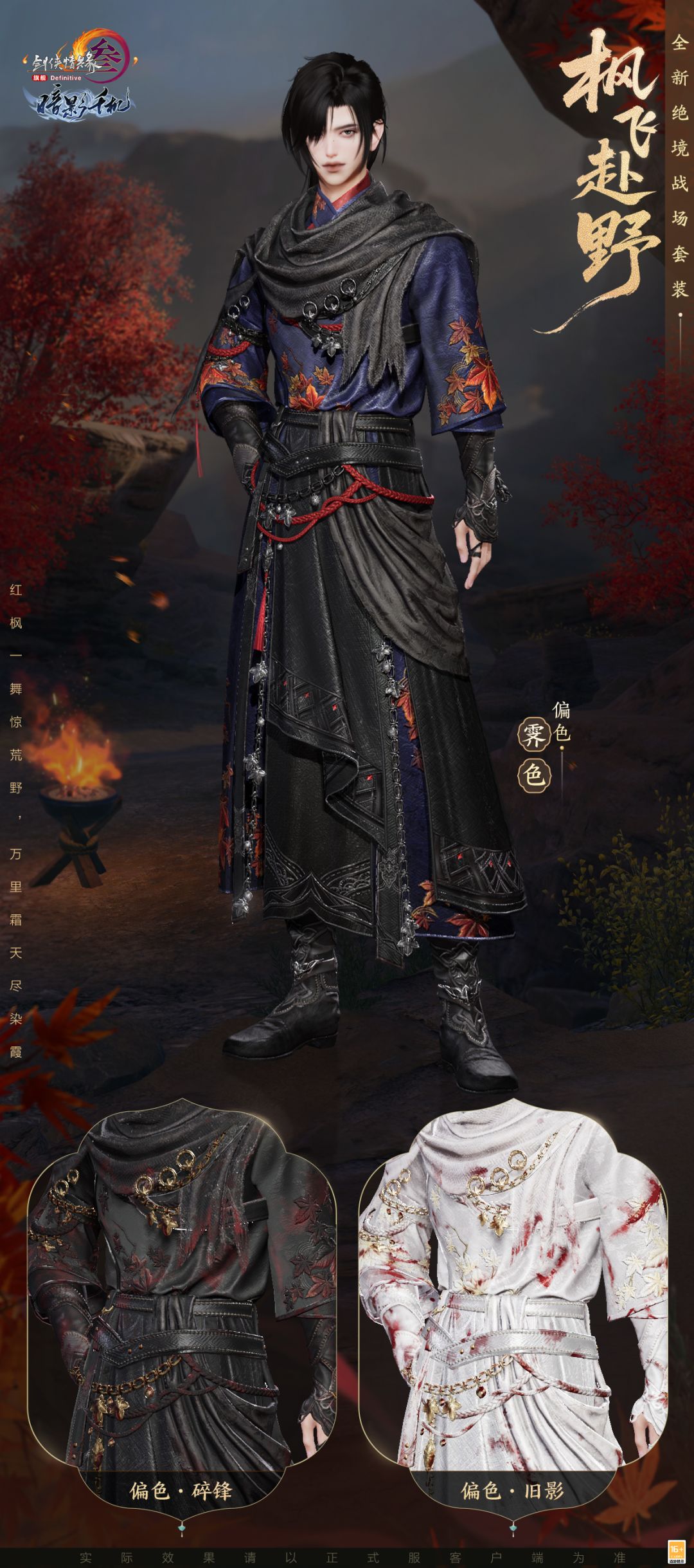挥戈驰骋,赤叶翻飞,如烈火般的澎湃热血在胸中激荡,此刻都化作凛然战意,昭然天地,气贯山河。将壮志豪情赋以具象的表达,《剑网3》全新绝境战场套装“枫飞赴野”今日亮相!