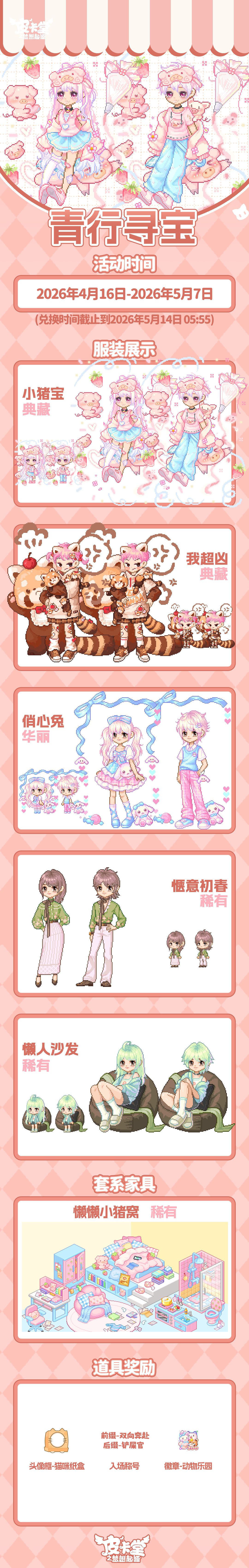 -【春行寻宝】活动限时上线!投掷骰子参与寻宝,沿着目标线路前进,即可获取活动徽章「动物乐园」、套系家具「懒懒小猪窝」及装扮「我超凶」、「小猪宝」等多重寻宝专属奖励!