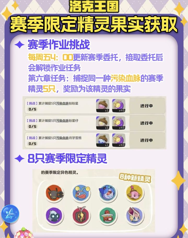 本次赛季一共上线 8 种全新限定精灵,全部都有「污染血脉」形态,完成对应捕捉任务就能拿专属果实,错过等一赛季!