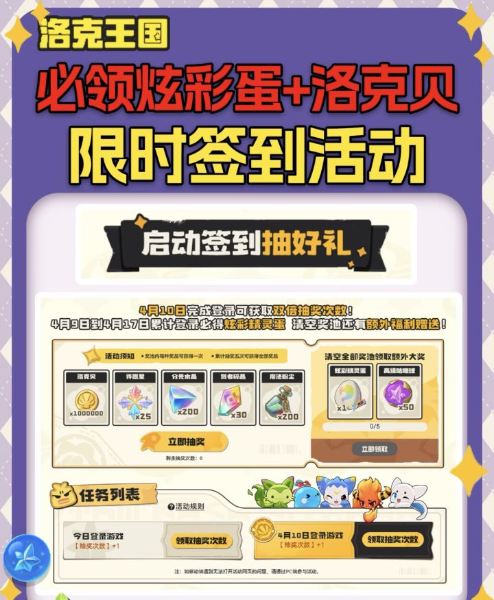 活动规则简单明了:每天完成登录可获得一次抽奖次数,其中4月10日登录可额外多领一次,当天共可抽奖两次。奖池内包含六种奖励,每种奖品限领一次,累计抽奖五次即可清空全部奖池。奖池具体内容为:炫彩精灵蛋×1、高级咕噜球×25、洛克贝×1000000、分光水晶×200、贤者碎晶×30、魔法粉尘×200。清空全部奖池后,还可额外领取一份大奖:炫彩蛋×1和高级咕噜球×50。