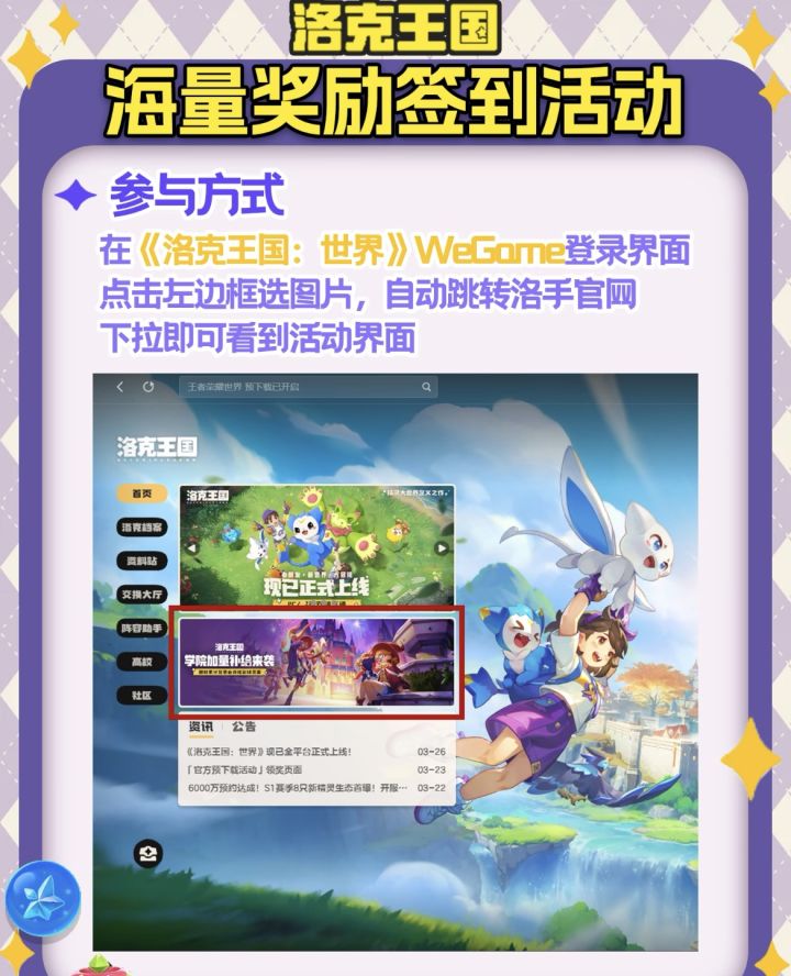 需要留意的是,部分移动端玩家在打开活动网页时可能会遇到问题,官方建议通过PC端参与活动。此外,WeGame用户可在登录界面点击左侧指定图片,自动跳转至洛克王国官网,下拉即可找到活动入口。