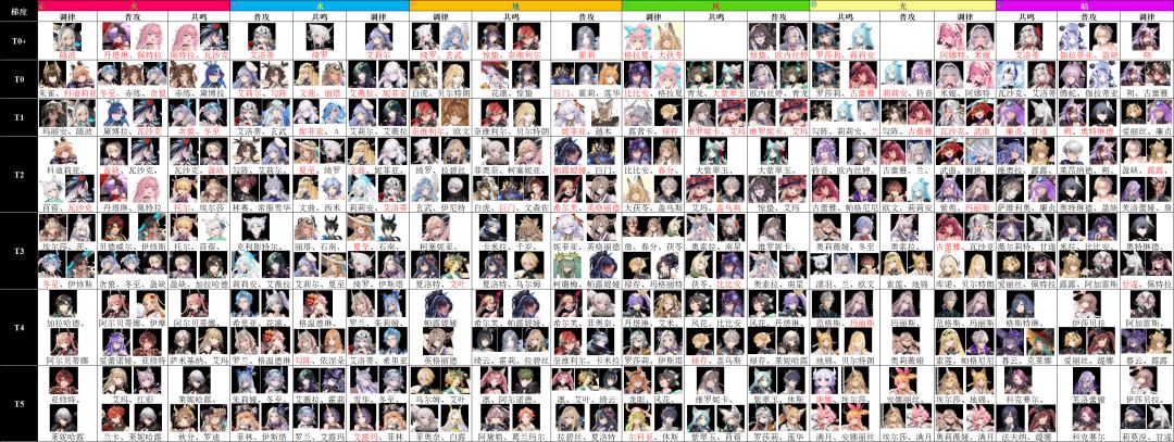 4、T0与T0+代表本队的核心角色,如果缺少则不推荐以该队作为主要培养对象;T1大部份情况下可以作为本队的前排上场,仅在强度上略逊于T0角色;T2一般作为本队的平替角色,在缺少t1角色或同调等级不足的情况下可根据环境和配置来考虑选择上场;T3泛用性一般,在特定场合下或角色配置不齐全时可以作为某些角色的下位替代;T4较弱,一般不会上场,只有在box不齐全的作为特定场合的对策解的时候才会偶尔有登场的可能。