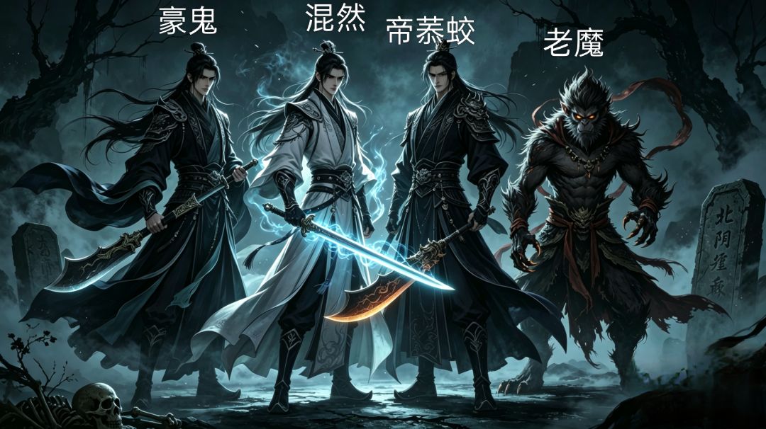 为首正是豪鬼,中年模样,看似豪爽,眼底却藏着深不见底的算计,是位刀修;身旁帝菾蛟傲气凌天,嚣张跋扈,锋芒毕露,刀修;浑然负剑而立,剑修气度沉稳,高深莫测;身后老魔猴相狰狞,魔气滔天,与魔猴同出一脉般凶戾。