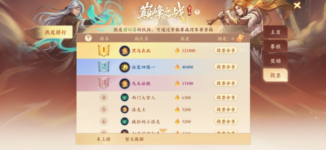【巅峰之战】赛事投票火热开启啦!快来为你支持的本服战队投票助威吧!票选前16名将进入资格赛,争夺代表本服征战的荣耀席位~