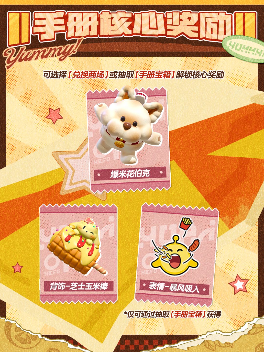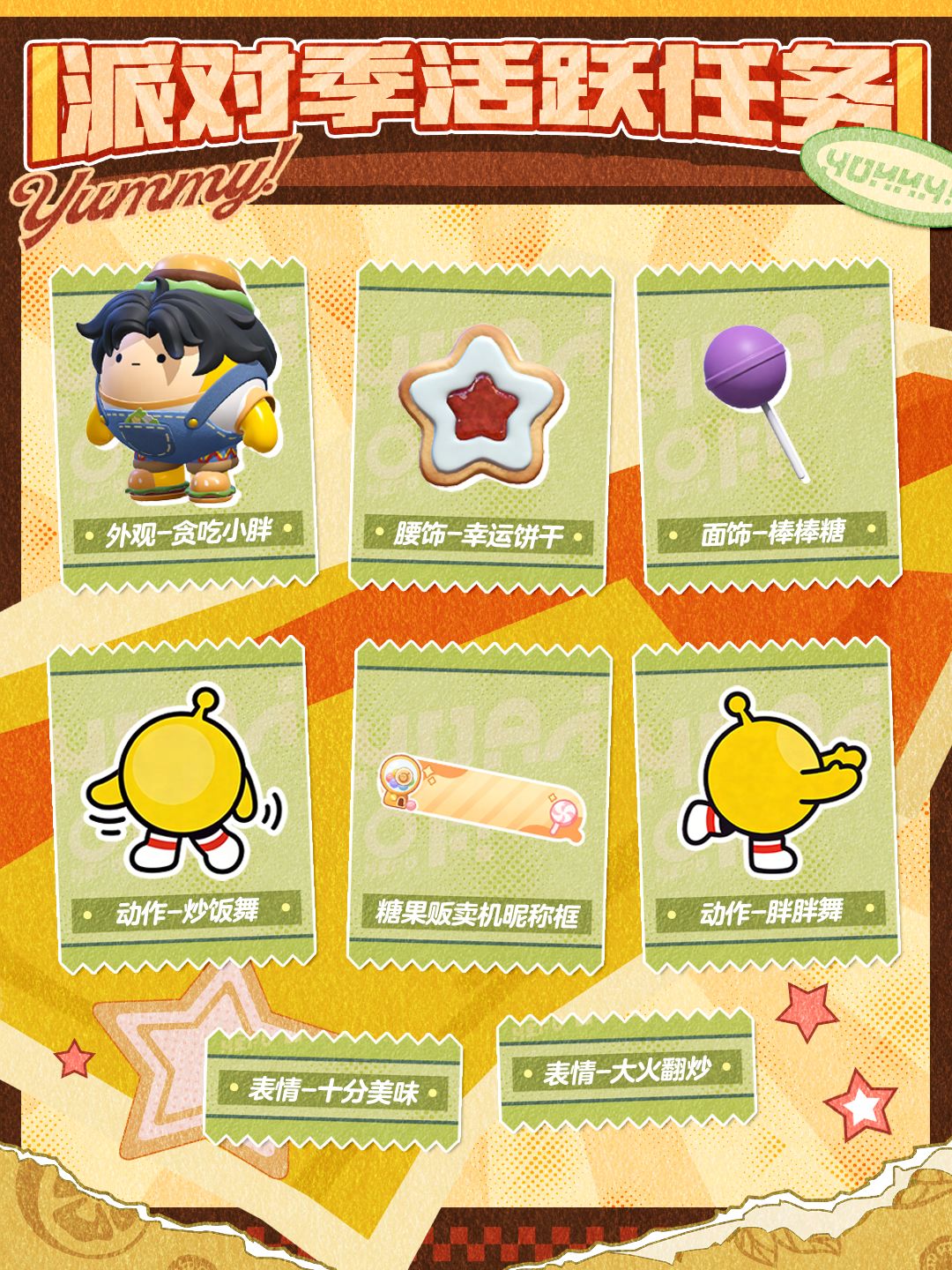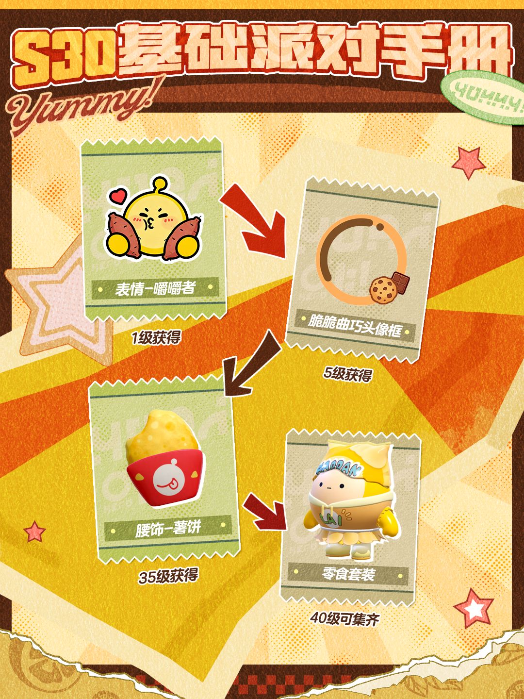 4月17日(周五)S30元气零食季来袭,<爆米花伯克>、<盖浇饭>和<饮料罐>诸多萌趣外观登场,<麻辣土豆片>和<芝士玉米棒>等配饰和动作上线!派对季盲盒、手册奖励和蛋位任务等全面焕新,是时候无所顾忌地开启暴风狂炫模式——