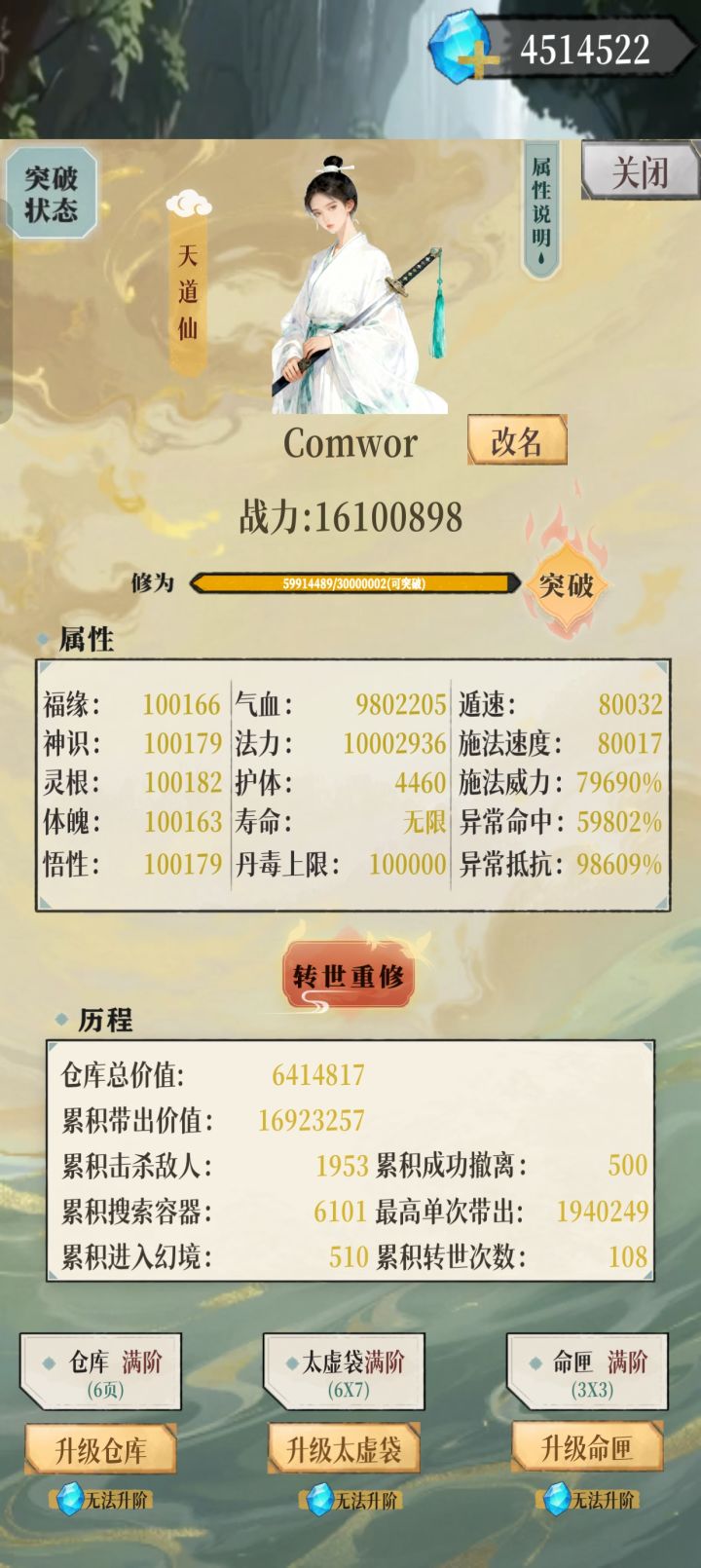 说真的,一个小游戏能让我玩这么久,作工还是算挺精良的。有结尾这点我给满分,就是洞虚没做突破丹,是不是偷懒了?不过一看时长,发现只超过27%的人,有肝帝在我之上,佩服。