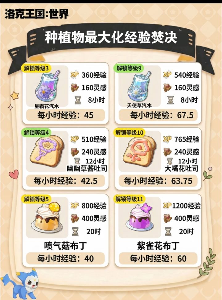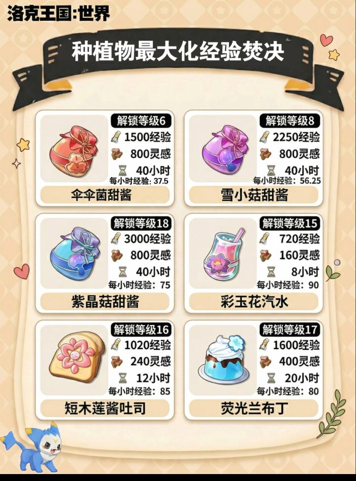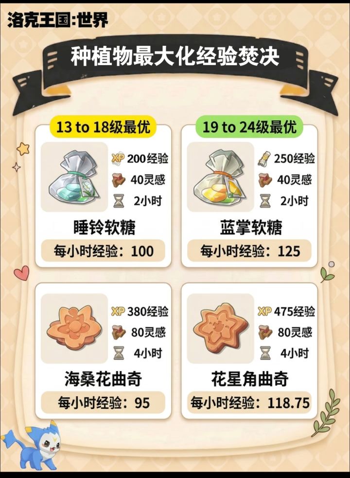 爆肝党(2小时收一次):1-6级种「向阳花软糖」,7-12级换「喵喵草软糖」,13-18级换「睡铃软糖」。这是目前经验效率的顶流。