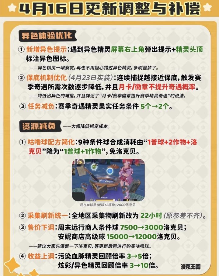 • 成本大降:条件球合成免洛克贝(1普球+1作物);商人球价下调;异色回顾收益提升至10倍。