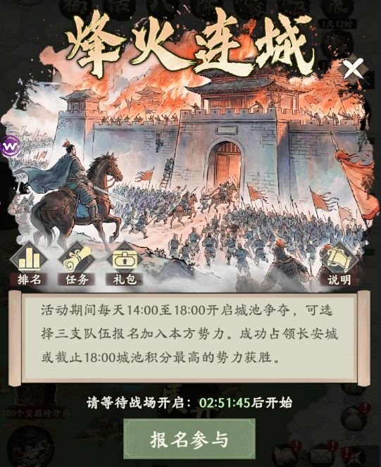 每日 14:00-18:00 开启的阵营城池争夺玩法,报名队伍武将和战法自动变为满级状态,仅可换兵种,以占领长安城 30 分钟或18:00 积分最高为单日胜利目标,核心依赖阵营协作+资源管理+战术选择。