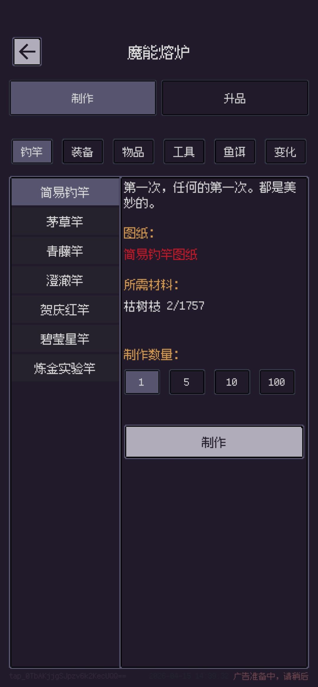 1适用于任何钓竿,当然了谁会用这个方法去升初始竿呢(怎么可能是因为开局就随手给简易竿的图纸融了后面直接造不了没法升😡)