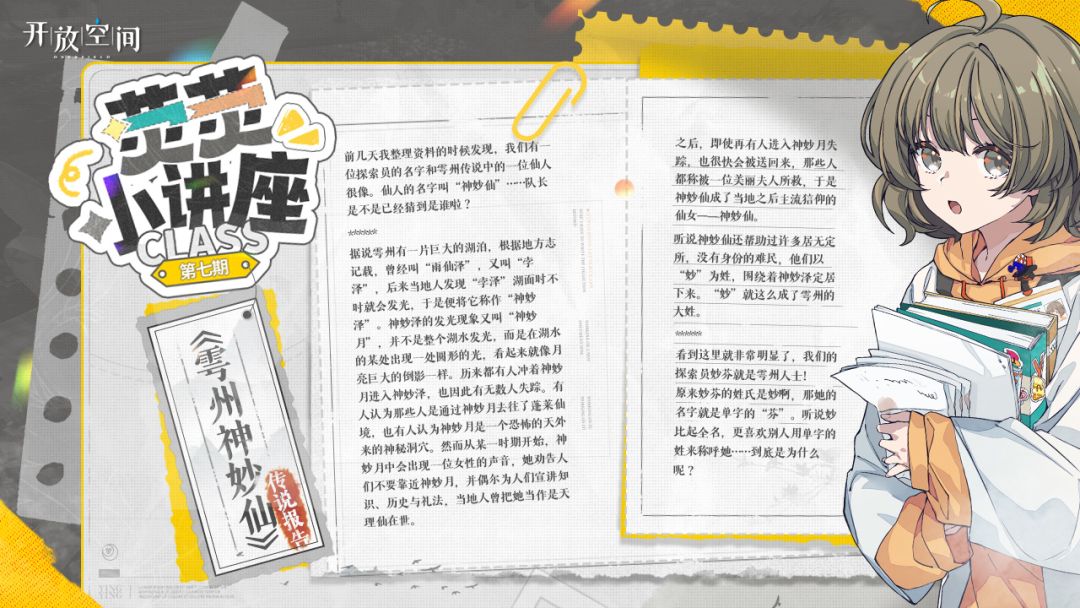 前几天我整理资料的时候发现,我们有一位探索员的名字和雩州传说中的一位仙人很像。仙人的名字叫“神妙仙”……队长是不是已经猜到是谁啦?