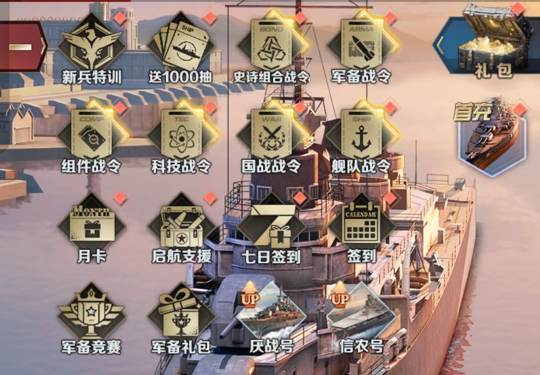 新手指挥官训练营,为期7天。每日完成对应任务即可积攒进度,累计完成所有任务,可免费领取:绿色军备箱*120、蓝色军备箱*30、建造令*20,最终大奖为德国传奇战舰 U-47 号,轻松开启海战征程!