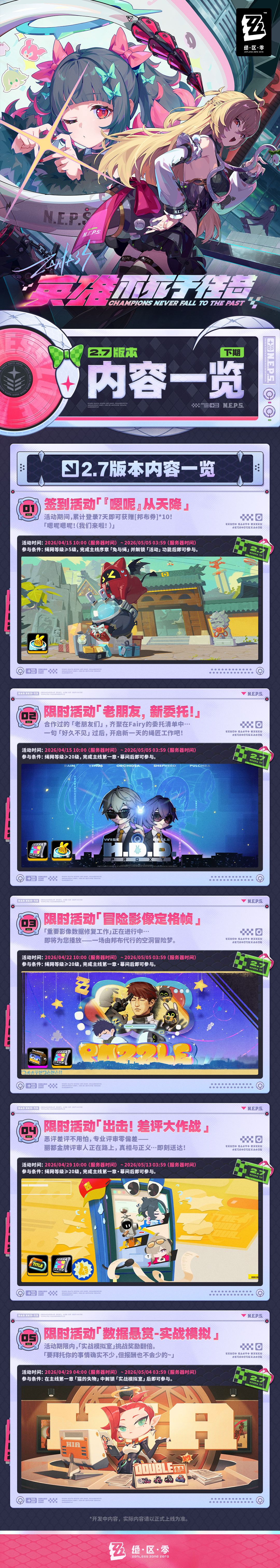 今日,《绝区零》官方发布「英雄不死于往昔」2.7版本内容一览(下期),聚焦版本后半程核心内容,全新角色、限定卡池、玩法升级与福利活动全面揭晓,为玩家带来更丰富的游戏体验。