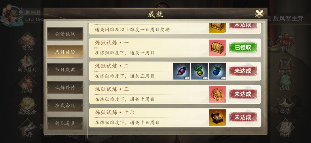 所以普通玩家要打炼狱一定要练果,演武练到4000层,拿转职,拿石头,合战前200层一定练满,出现不屈将到2000层之间也必须练满,我未练满20回合损失太大,要不炼狱或许会更轻松点!合战2000层可以拿很多有用特技!平时周目能练果也需要练果!现在出了海外,每周目海外必须打,特技印2阶石头就这里拿,然后端午每周目必须打100个果子!至于其他只能慢慢来!