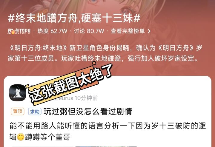 其二便是本家目前还没出完岁兽,第十三位的设定却在衍生作品《明日方舟:终末地》中率先落地,不少玩家因此破防认为这是本家剧情未填坑就挪给新作引流,伤害了本家角色厨的情感。
