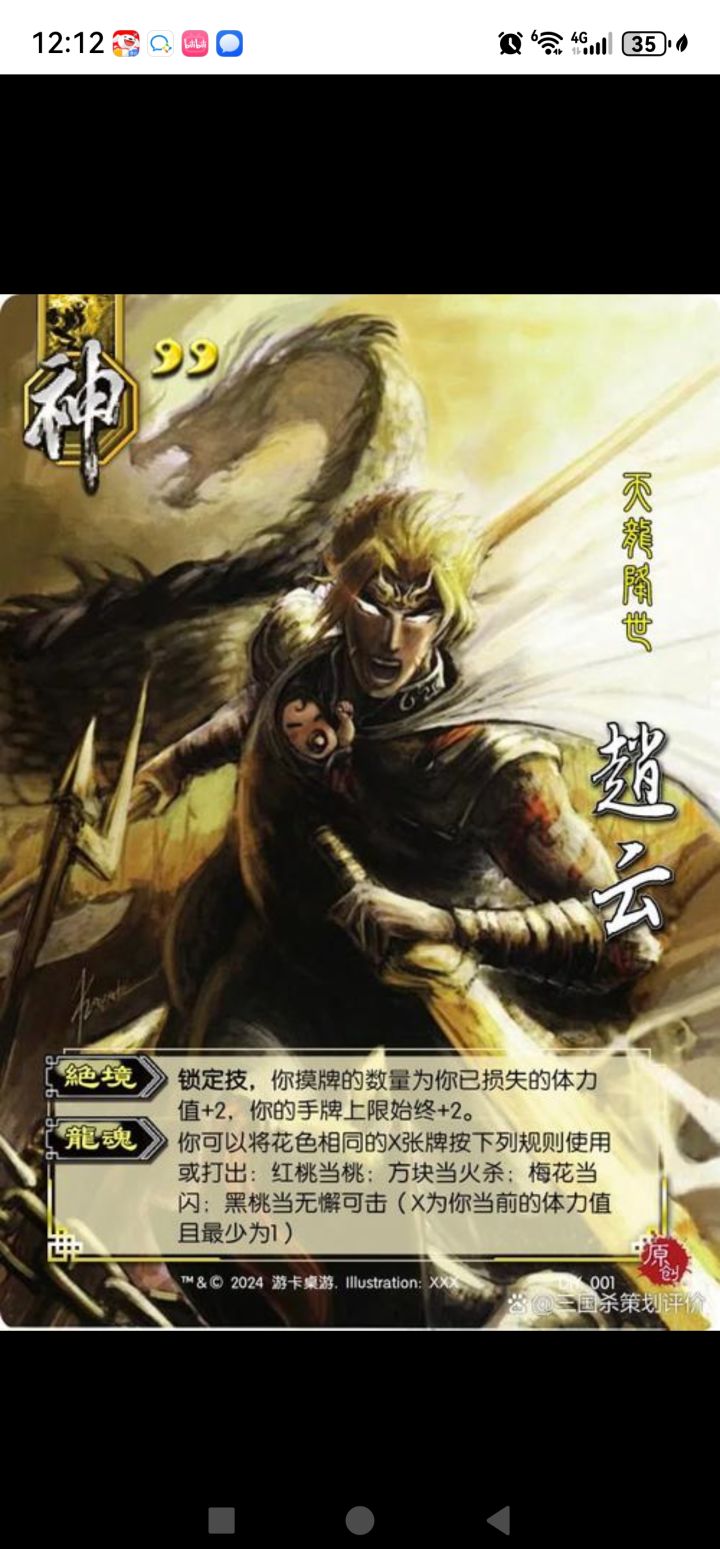 龙魂: 每次普攻后视为出一张闪,获得闪效果,闪避后视为出杀,获得一次普攻;濒死时30%获得一张桃,恢复30%血量,每回合无次数限制;收到普通攻击时,30%获得闪;收到绝技攻击时,30%获得无懈可击,免疫该伤害(仅对自身生效)。