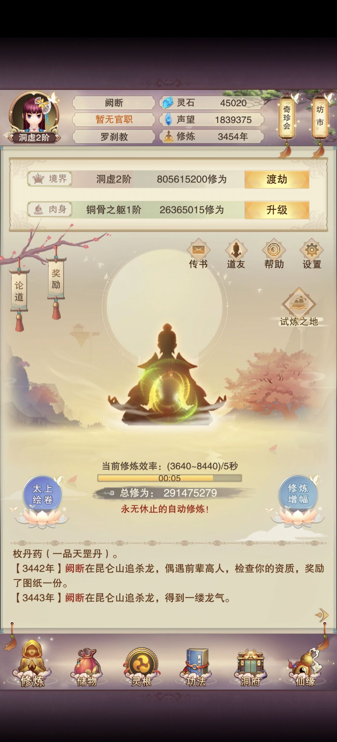 点完秘诀和攻防,开打今日功德3,7.72w防秒过。洞虚1刷齐是可以过功德3的