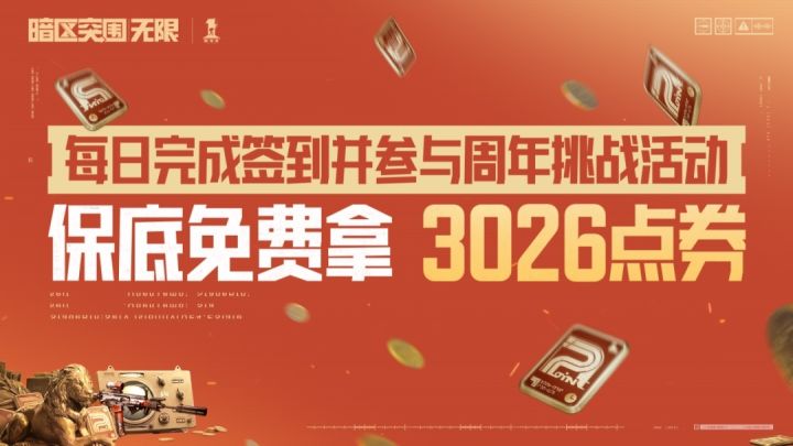 一周年福利直接堆成山,光免费福利就够肝帝狂喜——8天签到+挑战积分,保底3026点券轻松到手,欧皇甚至能拿1万+,军需随便换!