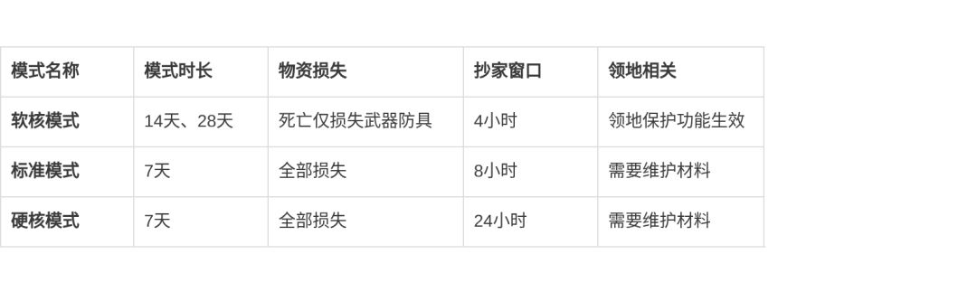 - 在标准与硬核模式中,玩法数值与现禁区难度相当,抄家窗口分别为8小时和24小时。